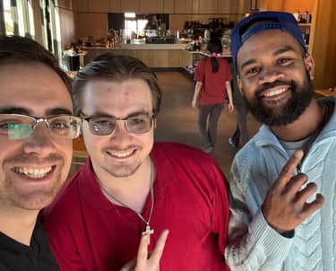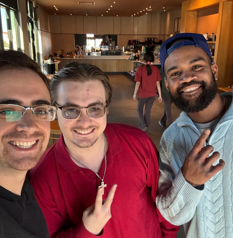 Sam (left) with paid actors male friends.
